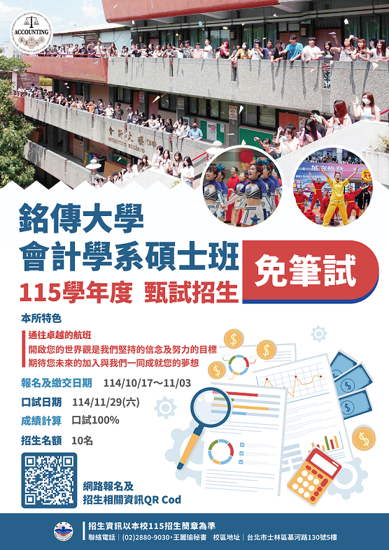 📢碩士夢想啟航!免筆試入學機會來啦!🤩 你還在對大學畢業後的下一步感到迷惘嗎?🤔 💡專為夢想家設計的超讚優勢! 免筆試!讓準備考試的壓力退散!👋 口試100%決勝!展現你的熱情與潛力就是得分關鍵!🌟 會計師夢想加速器:想考取會計師執照,卻苦於上班或找工作沒時間專心讀書嗎? 📚來碩士班,給你黃金學習時間,讓你事半功倍!🎯 ⏰報名資訊看這邊! 報名及資料上傳時間:115/10/17(五)-11/03(一)(時間緊湊,請儘早準備喔!) 上傳資料包含:歷年成績單、進修計畫書、自傳、其他有利申請資料 口試日期:11/29(六) 錄取榜單公告:12/05(五) 錄取名額:10名 👉抓住機會,讓碩士學位成為你職涯起飛的推進器吧!🚀 📞有任何疑問歡迎來電洽詢:(02)2880-9030,我們等你喔!