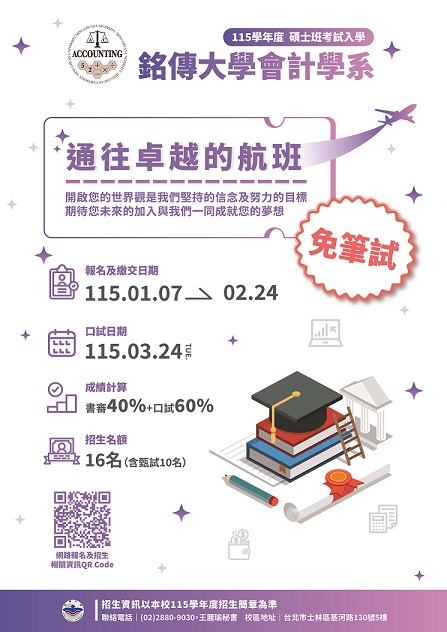 115學年度【銘傳大學會計系碩士班】考試入學報名開跑!