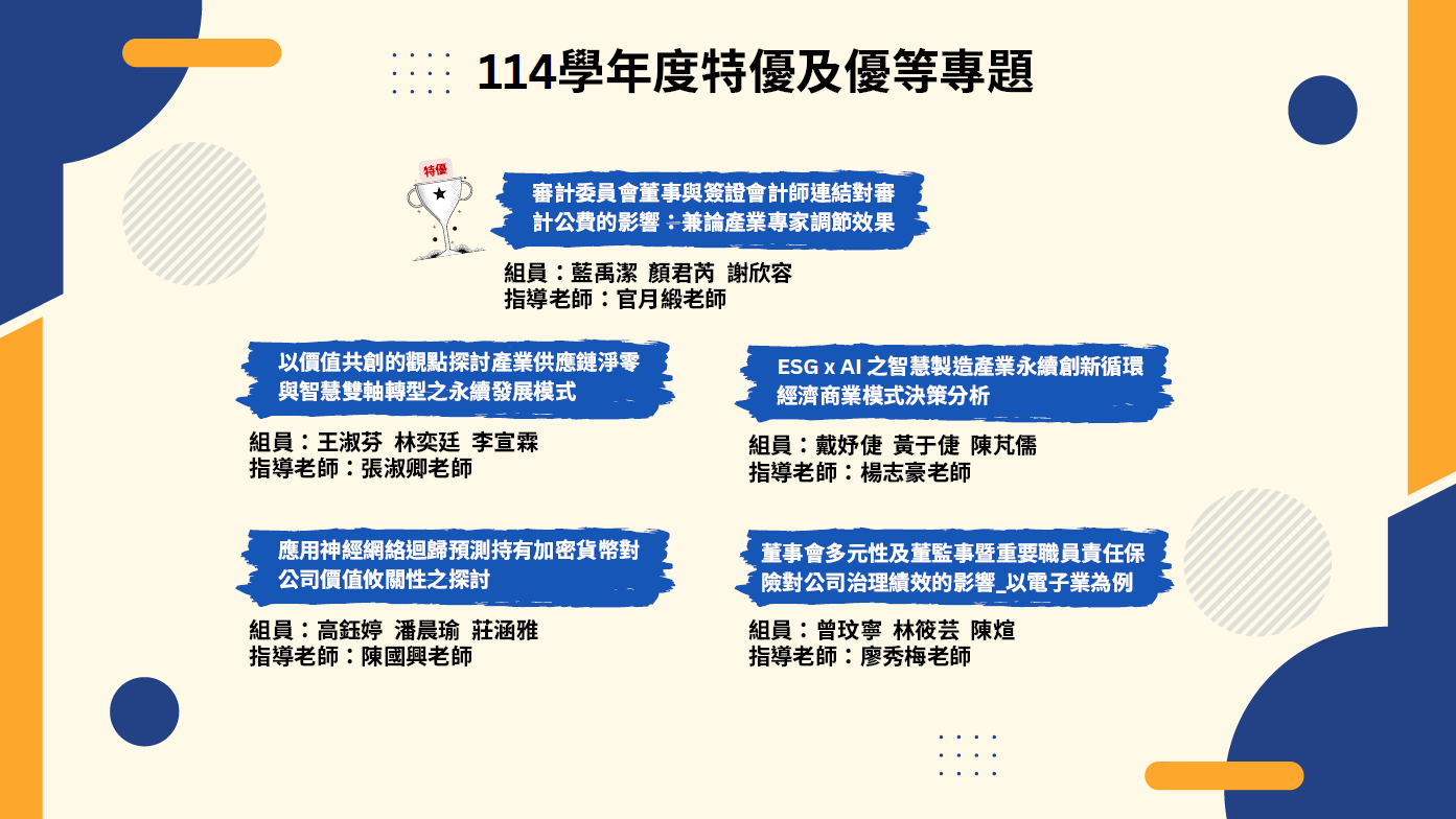 114學年度獲選會計系優等、特優之專題研究 liyuwang 2026-02-05 系所公告 本年度的大四專題評選,入選組別的票數在決選時產生小小的拉鋸,最後進入第三階段評審討論,終於選出1組特優論文、4組優等論文,恭喜獲獎的師生。